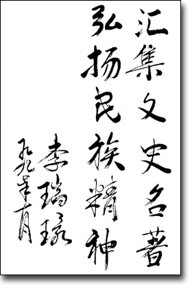 1990年10月,李瑞环为《古代文史名著选译丛书》题词:“汇集文史名著,弘扬民族精神。”