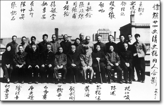 1973年春,“二十四史”点校组部分学者与中华书局工作人员在北京王府井大街36号中华书局合影。照片周围的姓名由启功先生标注。