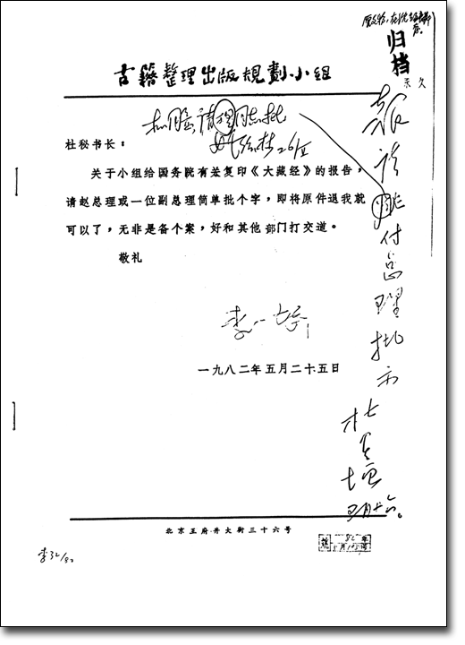 中华书局《中华大藏经》出版档案,姚依林、李一氓、杜星垣亲笔批示。