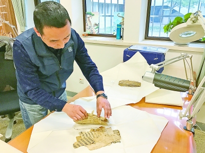修复师刘建明小心翼翼地整理破损的西夏文献。本报记者 方莉摄