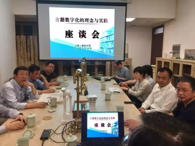 5月18日上午,中华书局总编辑顾青、中华书局古联公司商务总监刘新、销售经理杨雪轩、编辑杨德乾等一行四人在复旦大学光华楼西主楼7楼虞锋书室与复旦大学的专家学者举行了“古籍数字化的理念与实践”座谈会。参加这次座谈会的还有复旦大学图书馆副馆长杨光辉、出土文献与古文字研究中心主任刘钊、中文系教授陈尚君、历史地理研究所教授王振忠、复旦大学出版社党委书记赵文斌、学术委员会委员龙向洋、上海世纪出版股份有限公司辞书出版社编审王友朋、上海博物馆研究馆员柳向春、中西书局编辑李碧妍等十余位专家学者。