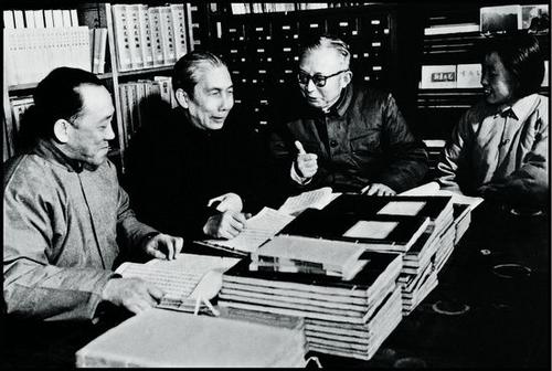 (坐起)中华书局编辑赵守俨、中央民族学院教授翁独健、北京师范大学教授白受彝、编辑何英芳在进行“二十四史”以及《清史稿》的点校工作。图/作者提供