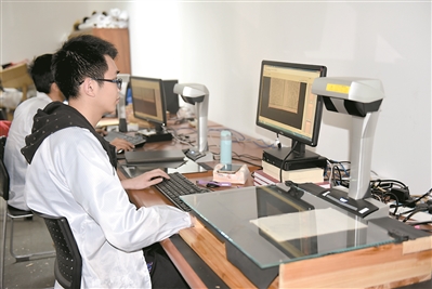 扫描作业在继续。技术人员对每张电子图片的明暗度、色温色差方面进行调节,以达到最清晰状态。图片是tif格式,每张的容量达到10兆左右,由于容量较大,生成一册(150页左右)古籍的电子版至少需要花费1个小时。
