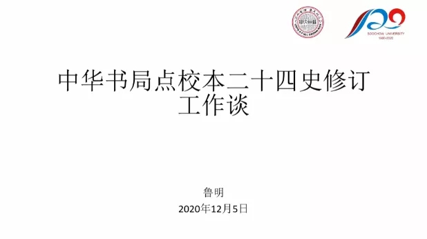 2020年12月5日晚18:30-21:00,中华书局编辑鲁明老师应苏州大学社会学院历史系之邀作了题为《中华书局点校本二十四史修订工作谈》的学术讲座。鲁明老师曾任中华书局《史记》、《旧五代史》、《新五代史》新点校本的责任编辑,目前从事《三国志》、《旧唐书》点校本的修订工作。本次会议由苏大历史系丁义珏老师主持,复旦大学陈晓伟、唐雯老师,南京大学武黎嵩老师,苏大历史系张程娟、林展老师等校内外学者与会,在线听众240余人。