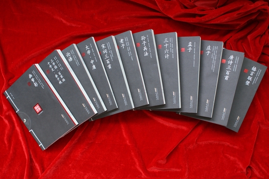 近观这套“总裁策划”图书,红色函套的《晚清名人睿语》与黑色系的《中华古典珍品》对比鲜明而相互映衬,中国红元素的暗合使整个系列风格和谐统一,典雅不俗。这套书的设计,出自国内书装设计大师未氓的手笔。封面采用烫银、烫黑、压凹等多种特种工艺,在装订方式上首次采用古典线装单铆钉设计,该装订方式简洁、牢固而风格古朴大方,该社已经将这一独创的装订方式申请专利。《晚清名人睿语》更是配上了精心制作的红木和丝绸面两种精装函套,格调清雅,品位不凡,使“总裁策划”逾越传统图书的信息载体的功用,兼具鉴赏、收藏、馈赠等多重艺术审美的功能价值。